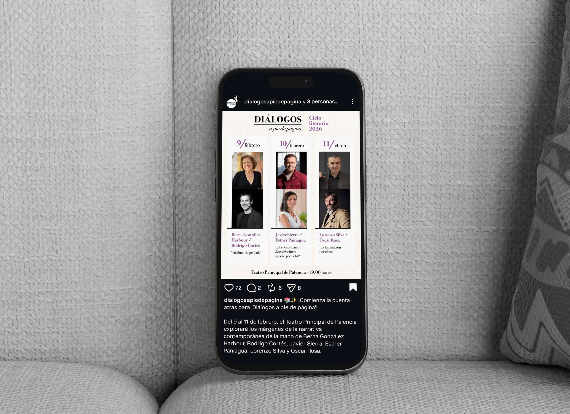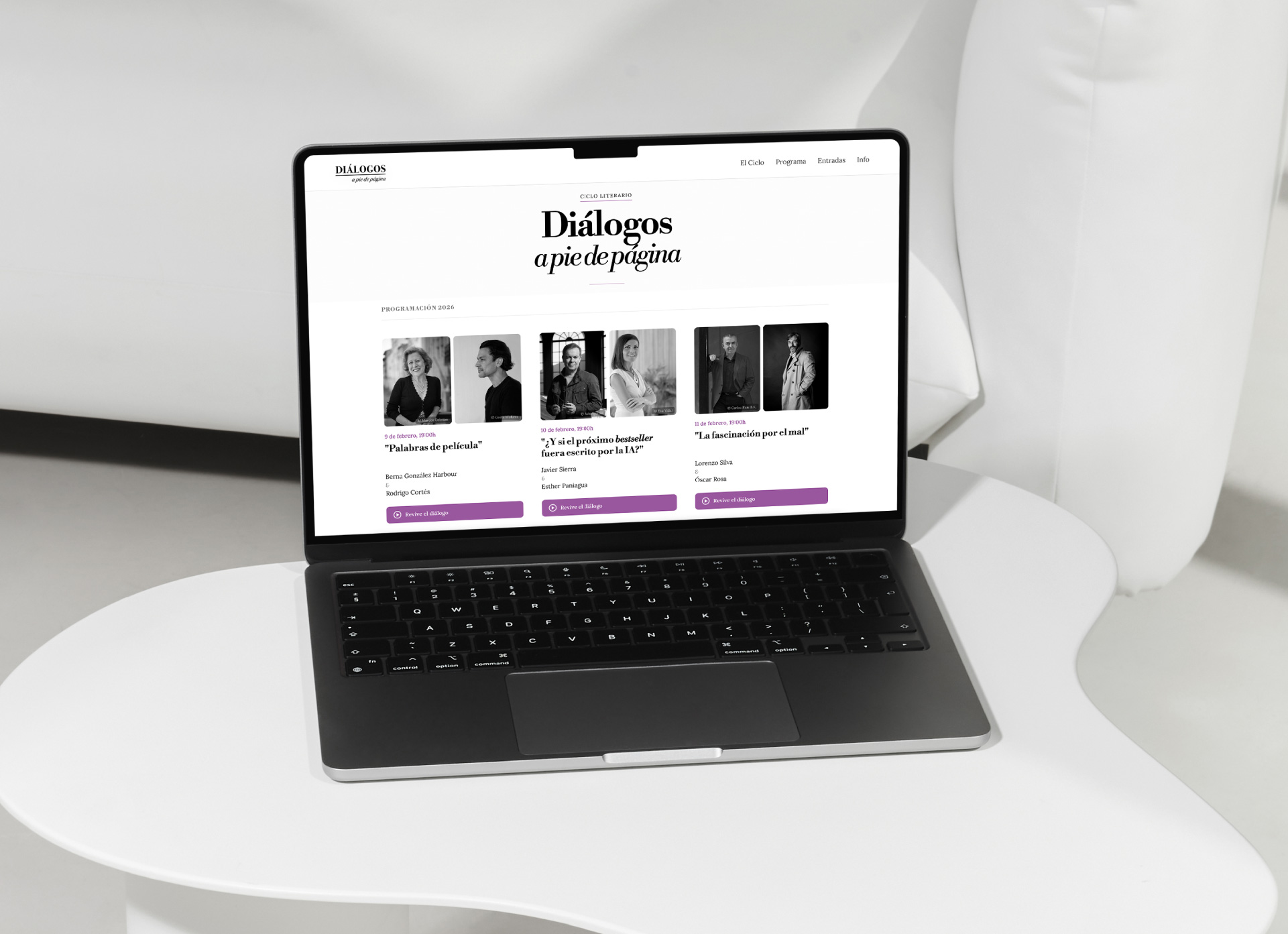 La editorial Menoscuarto nos confió la creación de la marca, la página web y la gestión de redes sociales de un nuevo ciclo de encuentros literarios patrocinado por el Ayuntamiento de Palencia: ‘Diálogos a pie de página’.