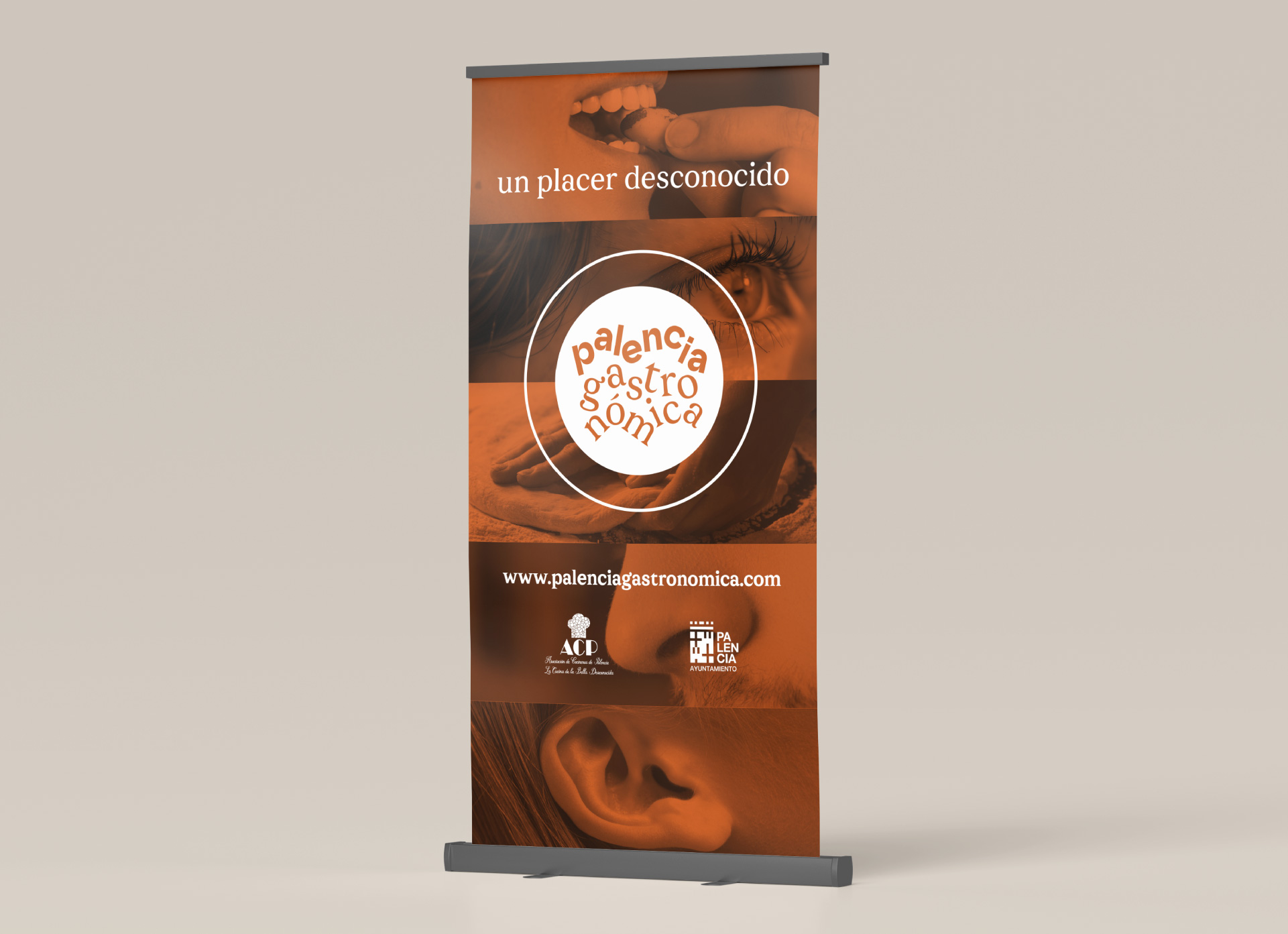 El proyecto arranca con la creación de la marca y su universo visual. El logotipo evoca un plato servido —redondo, sencillo, esencial— donde las propias palabras “palencia gastronómica” no aparecen como adorno, sino como contenido: son el alimento que ya está en el plato, listo para ser descubierto. El eslogan “Un placer desconocido” traduce en una frase la propuesta de valor del sello: una declaración honesta y sugerente que invita al visitante a mirar Palencia con otros ojos y con otros sentidos.