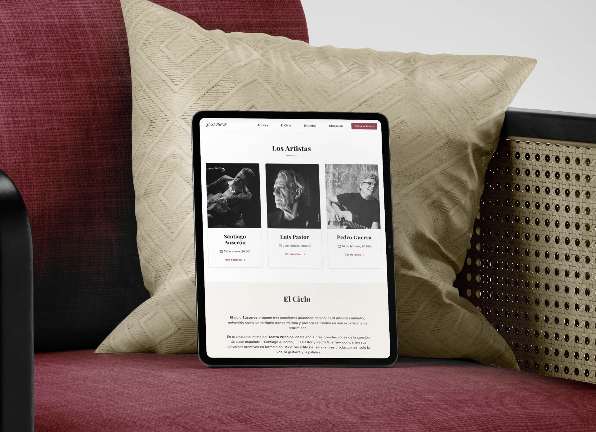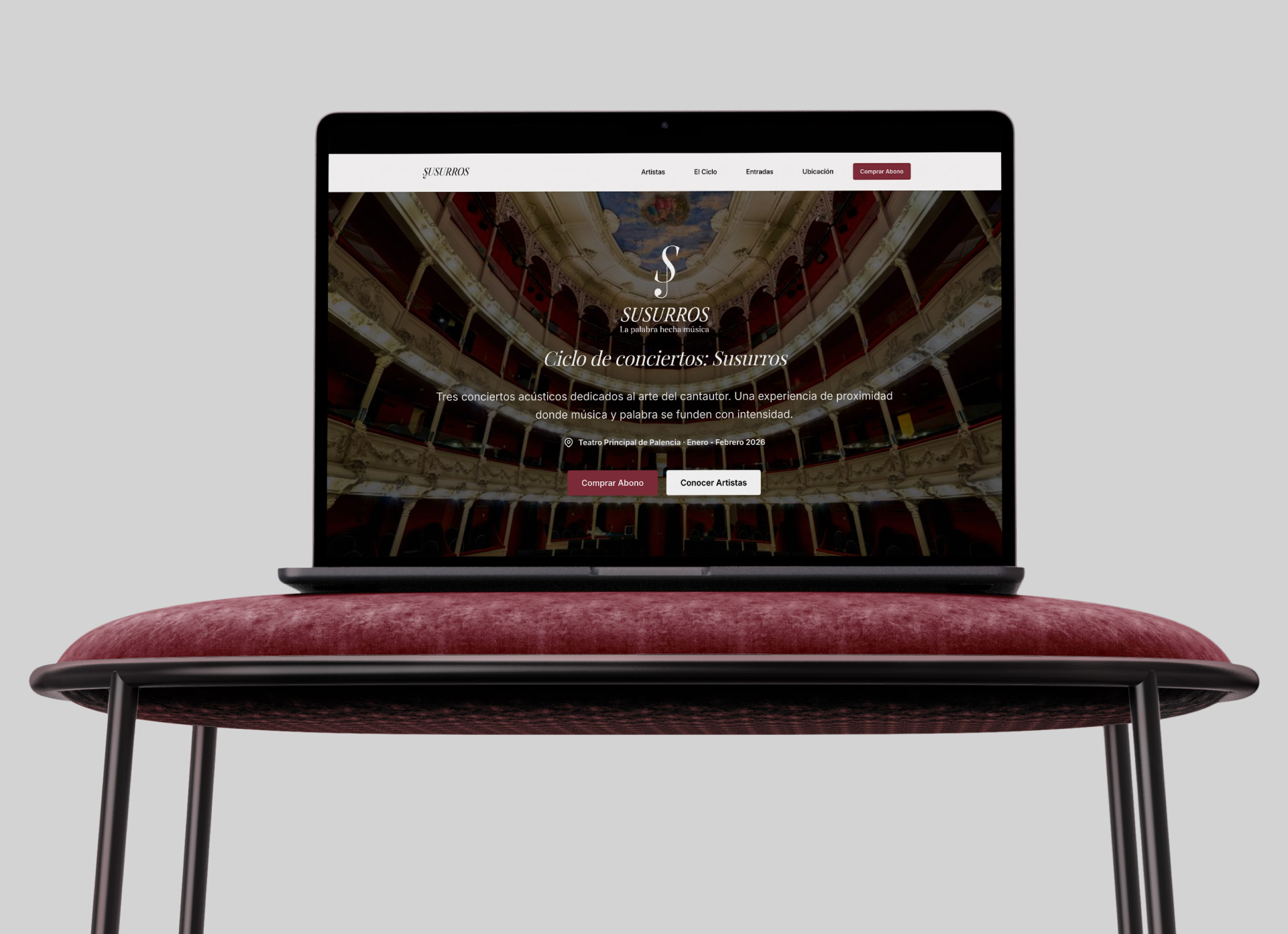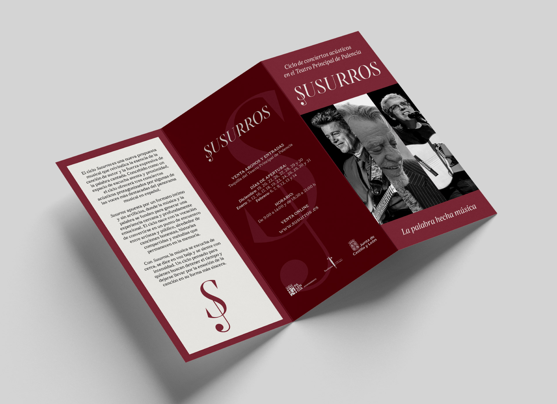 ‘Susurros’ es un ciclo de conciertos acústicos dedicado al arte del cantautor, celebrado en el Teatro Principal de Palencia. Nos encargamos de concebir y desarrollar su identidad visual y su presencia digital.